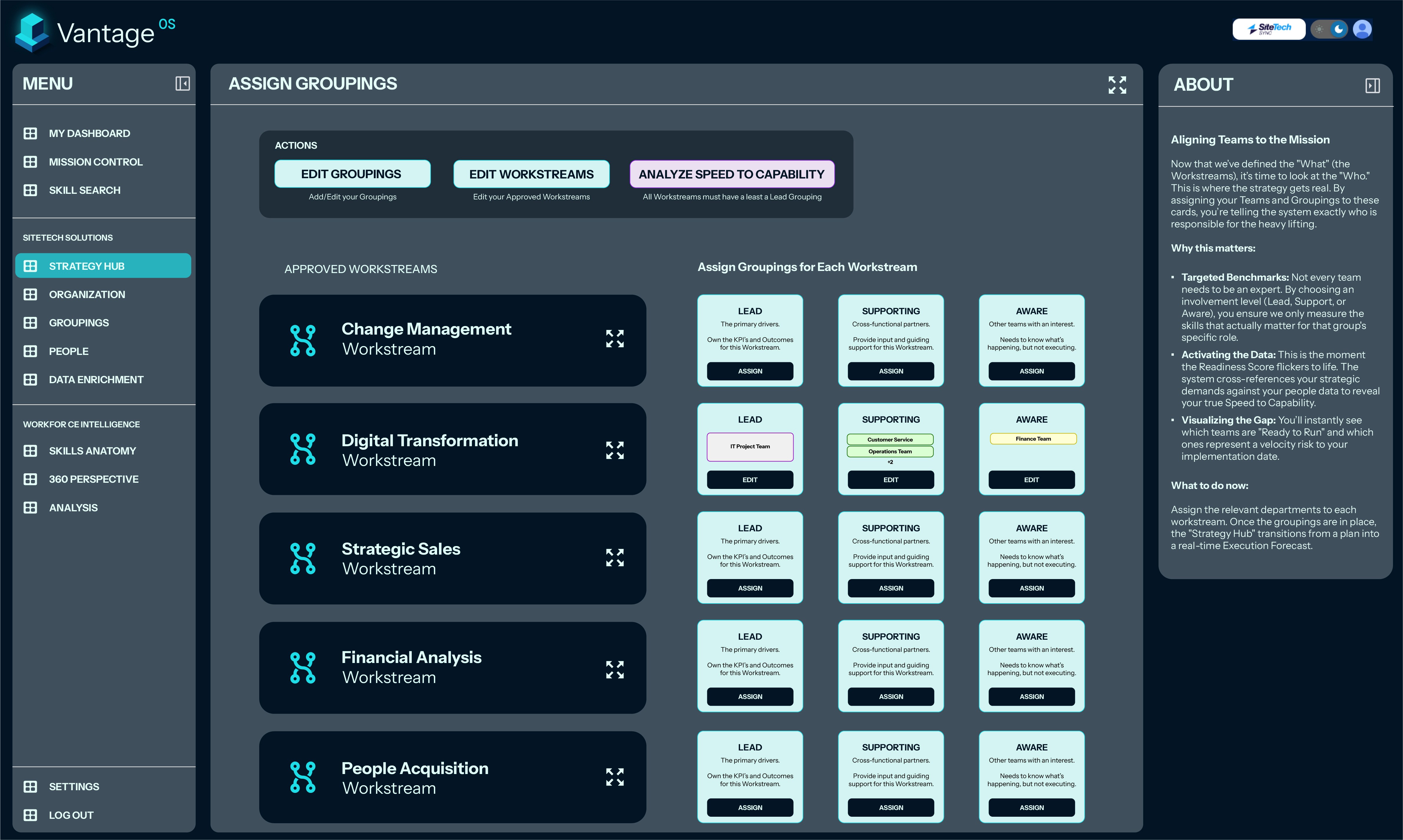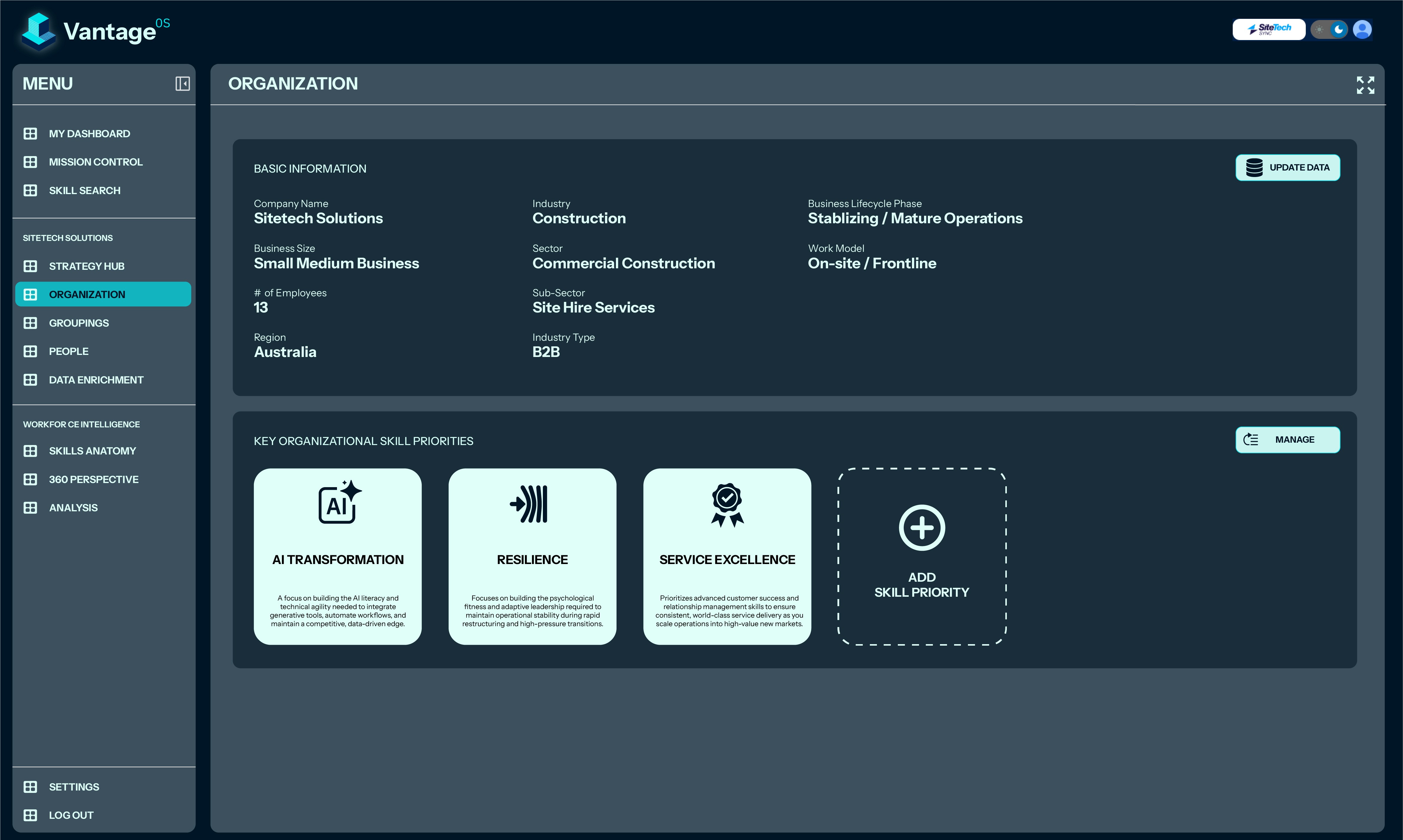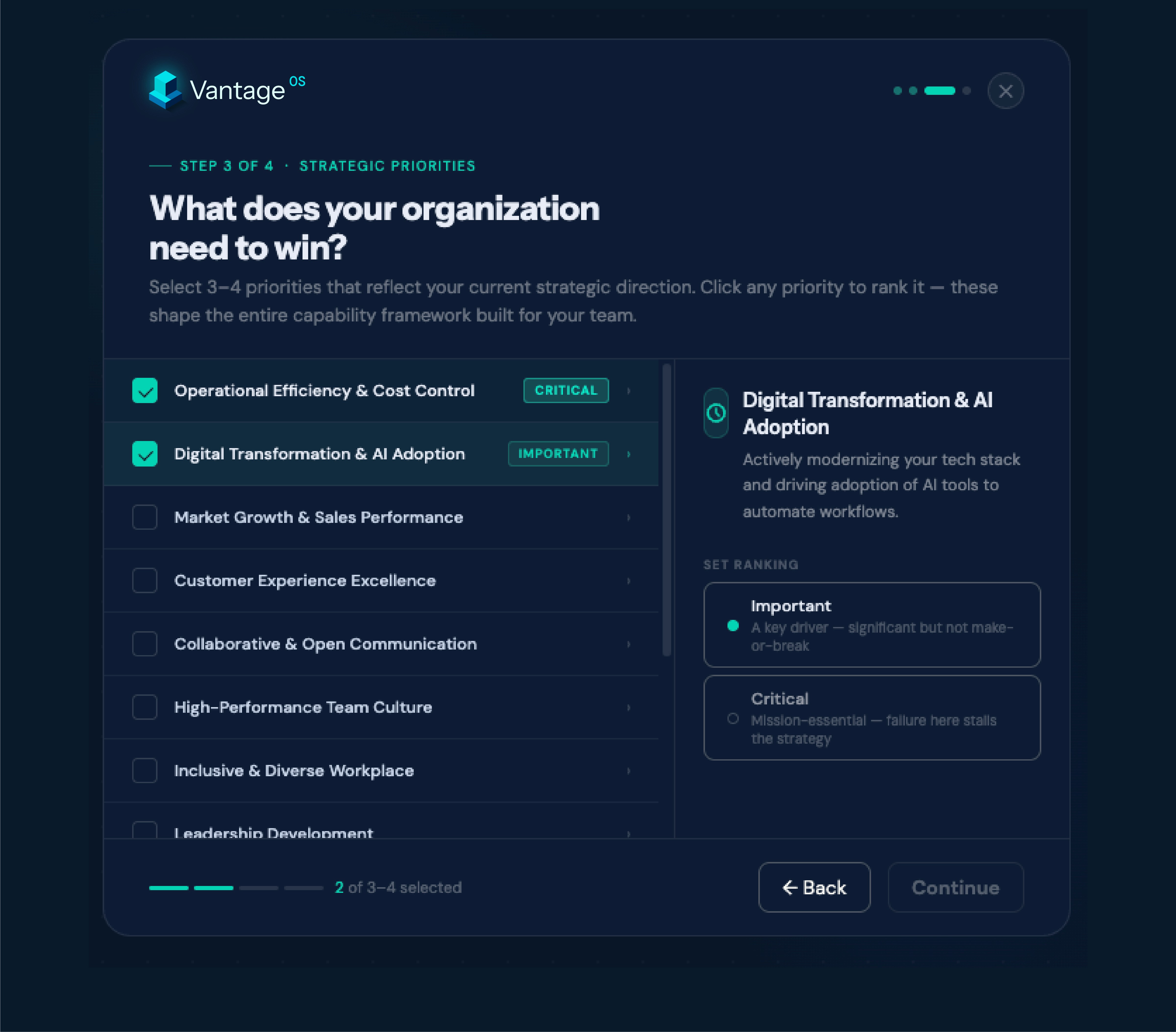VantageOS is the operating system that establishes a mathematical baseline of your workforce's skills, aligns it directly to your business strategy, and shows you exactly how to close the gap.