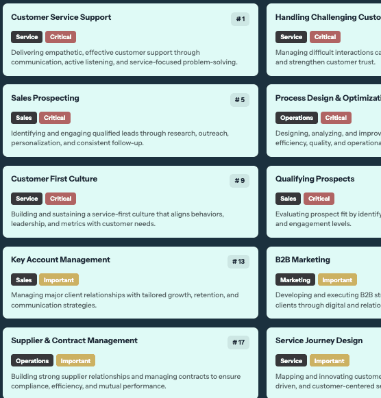 Our proprietary Skills Engine acts as the algorithmic brain of the platform. Rather than using generic templates, it ingests your specific company context, role data, and strategic goals to automatically assign and rank the exact capabilities required for every role using our rigorous 181-cluster architecture.