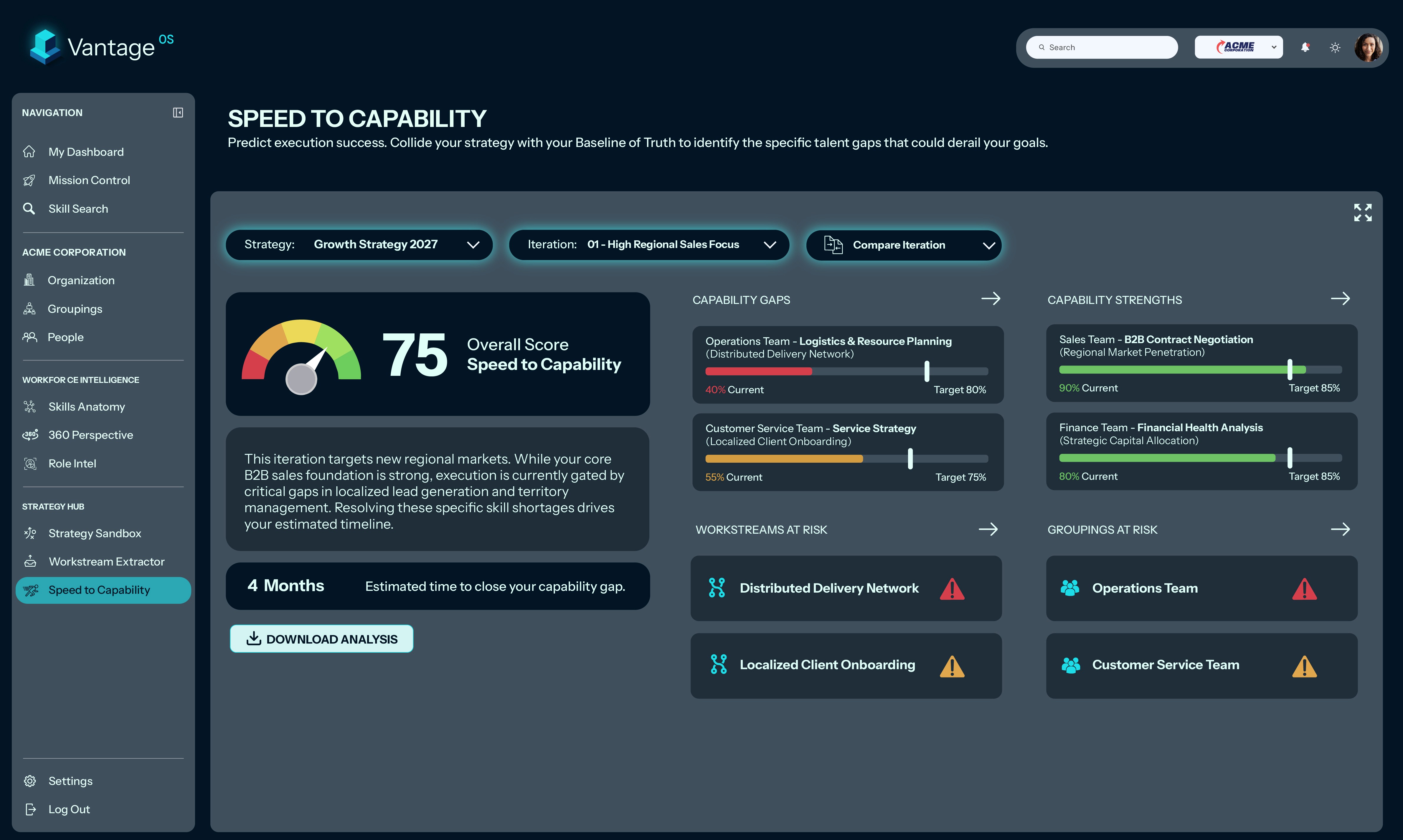 Step 4: Forecast & Orchestrate: The system instantly exposes the "Velocity Gap," calculates your exact Speed to Capability (StC), and arms leadership with the predictive timelines needed to close skill gaps before launch.